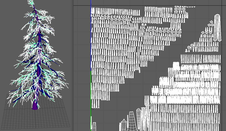 I started with a Speedtree model Misha created of a pine. From there we needed to bring it down poly count wise to something more manageable and make it feel a like more like a pine tree. From there I exported it and brought it into Maya and manually moved a bunch of branches down to feel more weighted. I tried to UV the tree so that it can be textured manually.